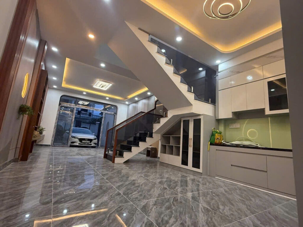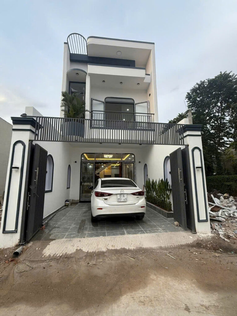Nhà 1 trệt 1 lầu có 3 phòng ngủ, 3 nhà vệ sinh, sân đậu ô tô rộng rãi.